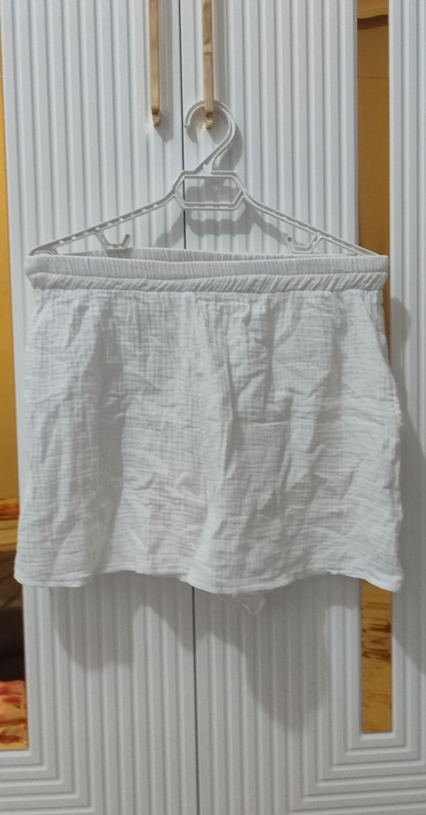 Yumuşak ve nefes alan keten kumaştan, pileli tasarımlı beyaz hamile mini eteği, rahat ve salaş kesim.