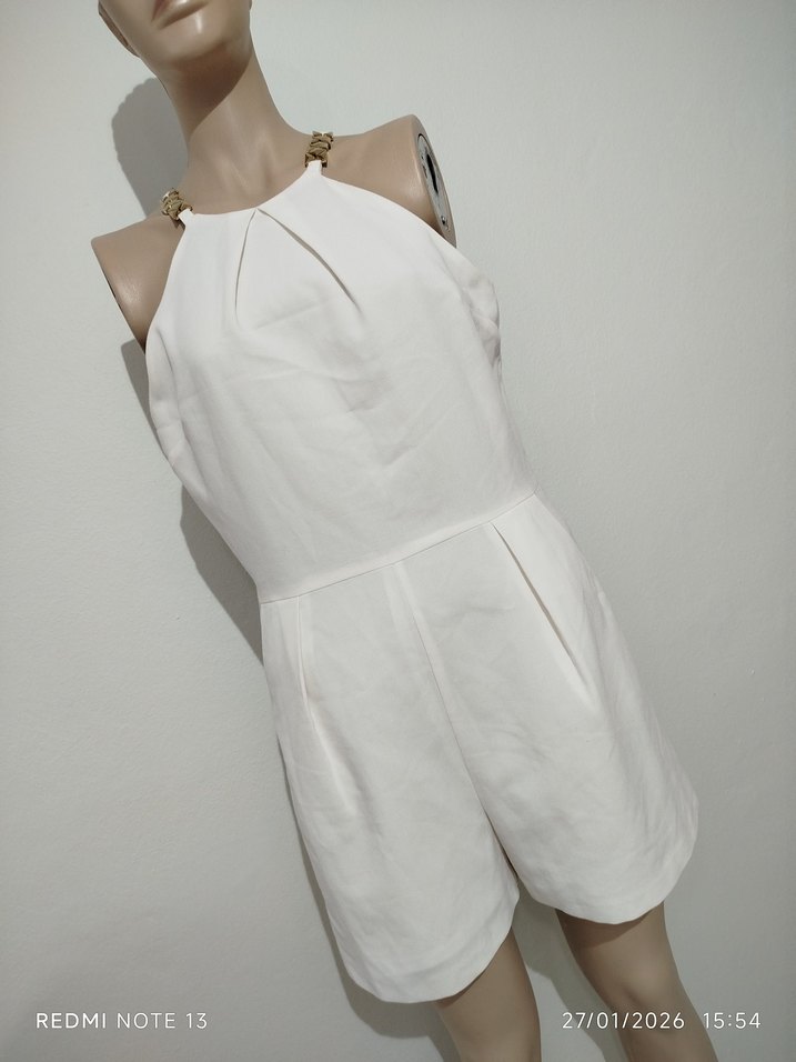 Beyaz keten mini tulum, askısız ve kolsuz tasarımıyla sade ve şık. Günlük kullanım için rahat ve minimalist bir stil sunar. ✨