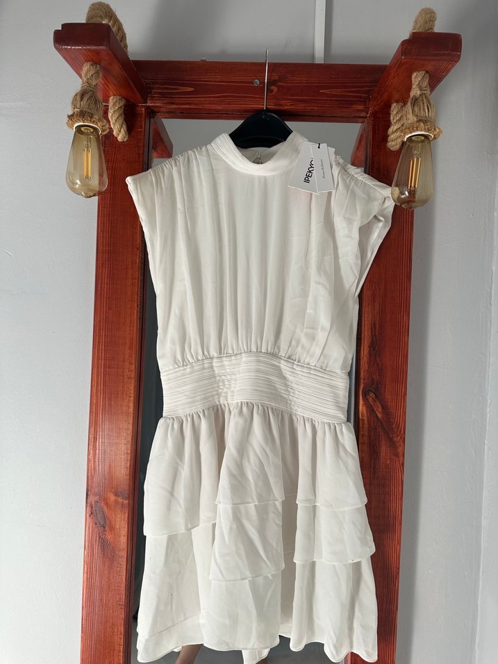 Yüksek yakalı, kolsuz beyaz mini elbise. Keten kumaştan, volan detaylı ve vücuda oturan kesime sahip. Bohem Paris tarzında, günlük kullanıma uygun. son görseldeki gibi hiç giyilmemiş olmasına rağmen ürün gelirken üzerinde böyle bir leke gördüm yıkanınca geçecek bir şey ama ben yine de çok indirimli ekliyorum