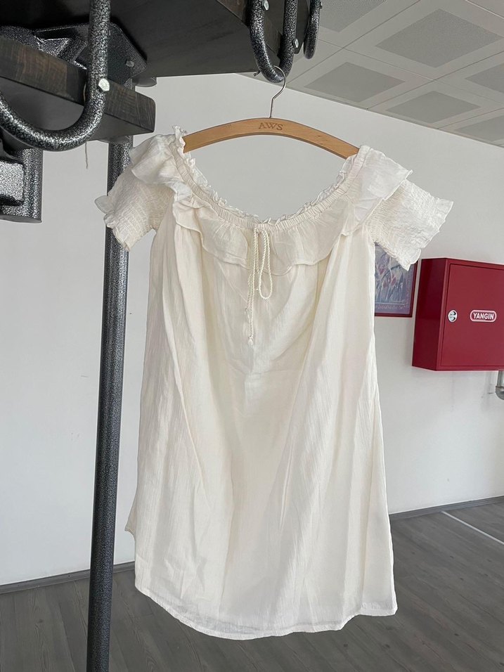 Beyaz keten kumaştan, kısa kollu, fırfırlı kayık yaka midi uzunlukta ve bol kesim bohem tarzı elbise.