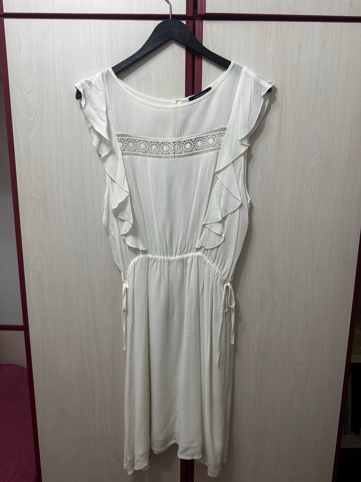 Keten kumaştan, nakışlı desenlere ve fırfır detaylara sahip beyaz, kolsuz midi elbise. V yaka ve bol kesim ile bohem tarzını yansıtıyor.