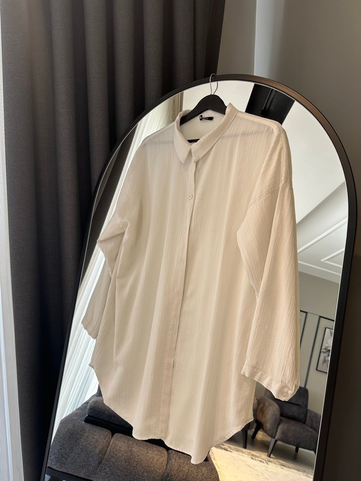 Beyaz keten oversize gömlek, yakalı ve uzun kolludur. Düğmeli ön kısmı ve midi boy uzunluğu ile rahat günlük sokak stili için uygundur. Standart bedendir