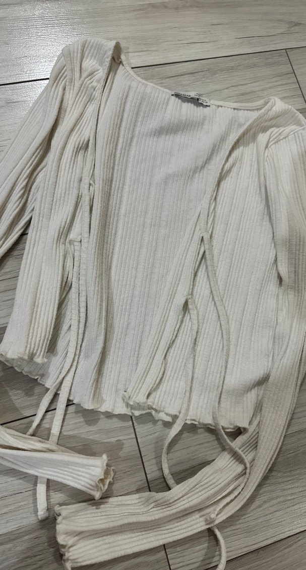 Beyaz keten kumaştan, pilili ve askılı kollu, tek renk, bohem stilinde, normal uzunlukta ve vücuda oturan rahat bir hırka.