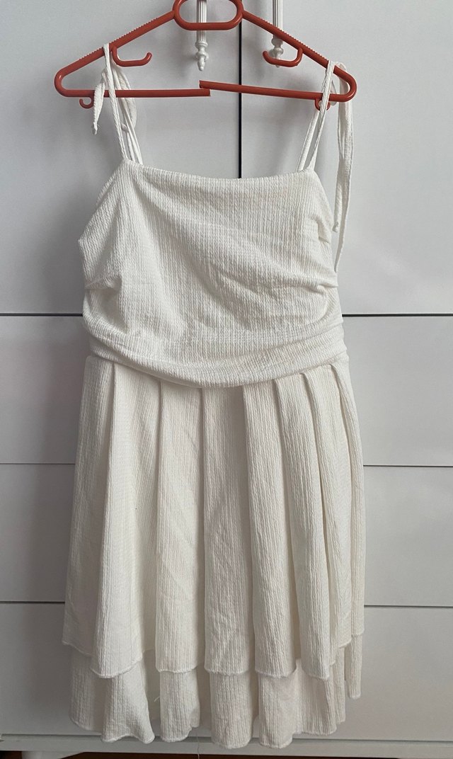Beyaz keten kumaştan, askılı ve straplez yaka detaylı, pilili ve bol kesim midi elbise.