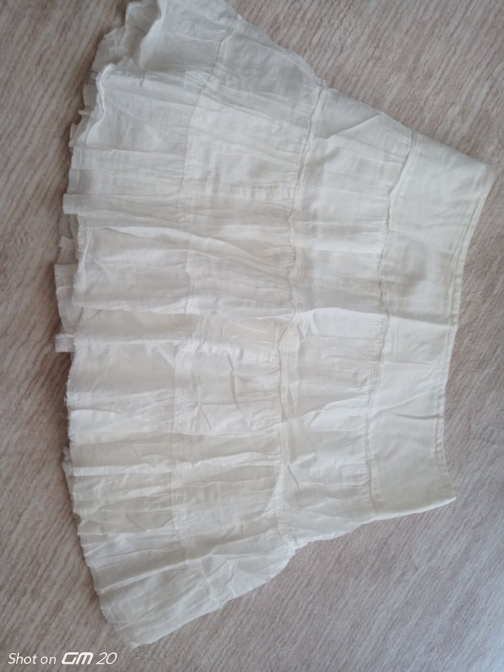 Beyaz keten pilili midi etek, bol kesim. Bohem tarzda, açık hava etkinlikleri için uygun. ✨