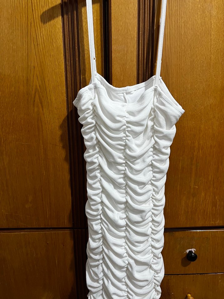 Beyaz keten kumaştan, pilili dokulu, askılı ve straplez yaka detaylı, normal boy midi mini elbise. Minimalist ve bohem tarzda, günlük kullanıma uygun.