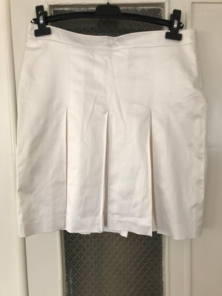 Beyaz keten pilili mini etek, hafif kumaştan ve düz desensiz. Ofis kullanımı için uygun, rahat bir kesime sahip.