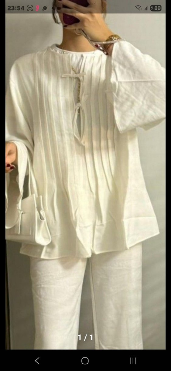 BEDENLER MEVCUTTUR.Beyaz keten kumaştan, pilili ön detaylı, yüksek yakalı ve uzun kollu, bol kesim mini kadın takımı. Bohem tarzıyla günlük kullanıma uygun.
