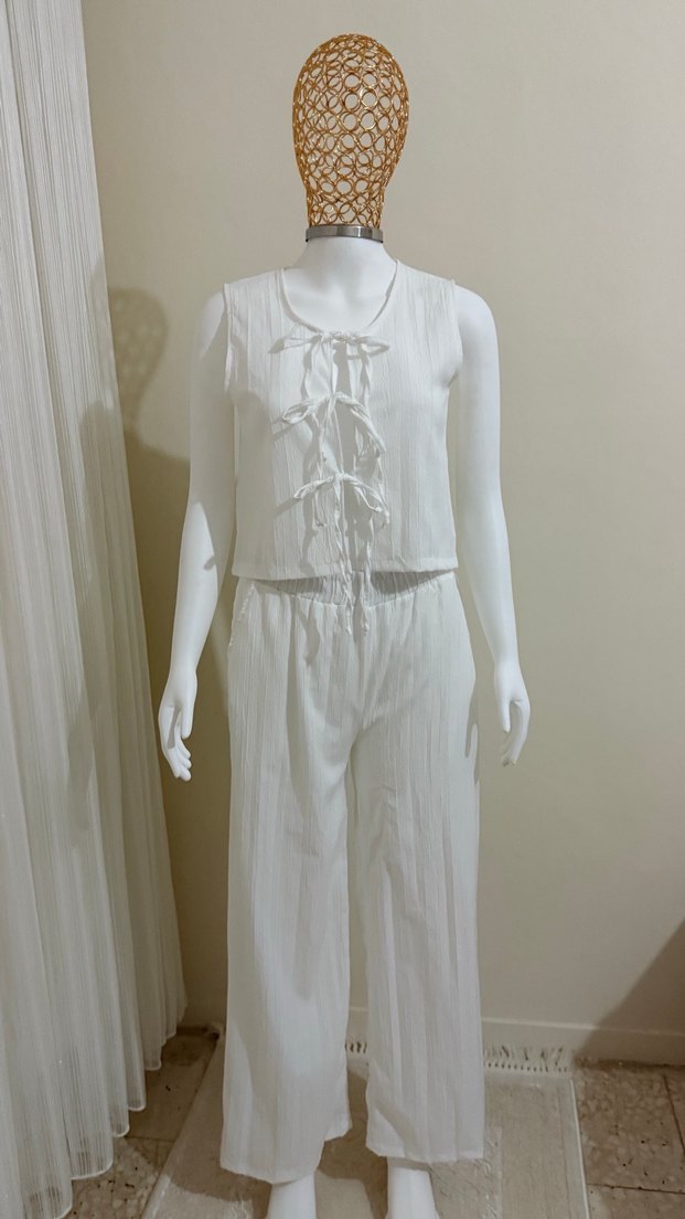 Beyaz keten kumaştan, pilili ve salaş kesimli, halter yaka, kolsuz uzun tulum. Minimalist ve bohem tarz için uygundur.