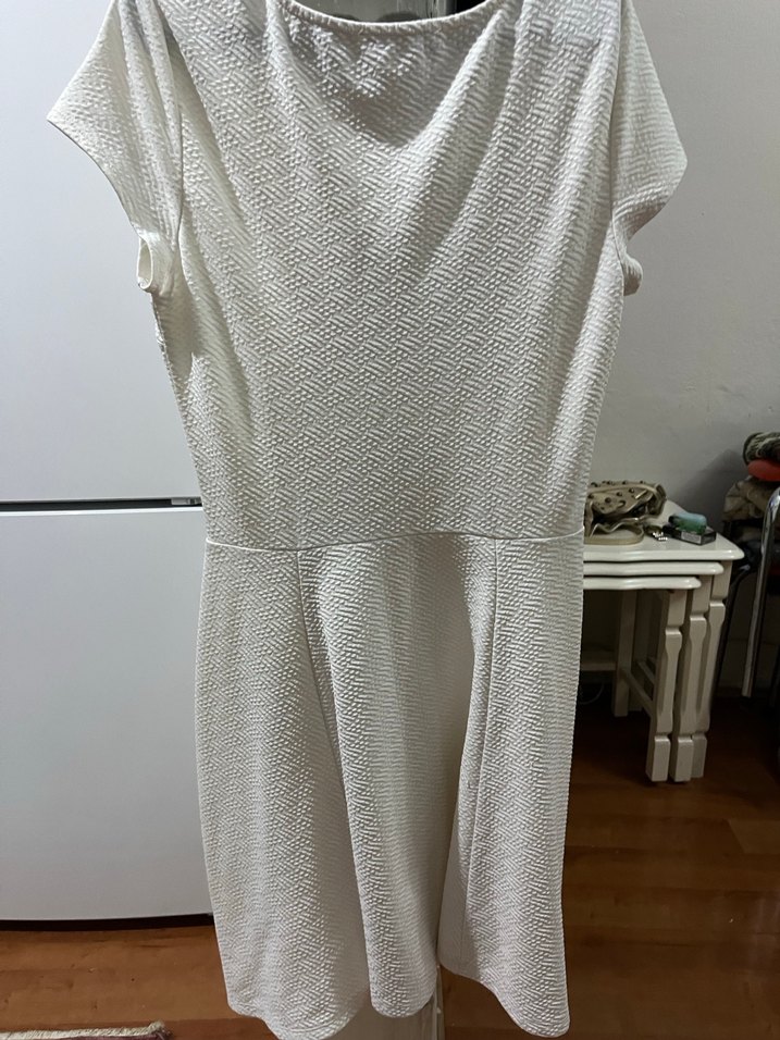 Beyaz keten kumaştan, pilili, V yaka, kısa kollu ve midi boyda, modern klasik kesime sahip elbisedir. Ofis ortamına uygundur.