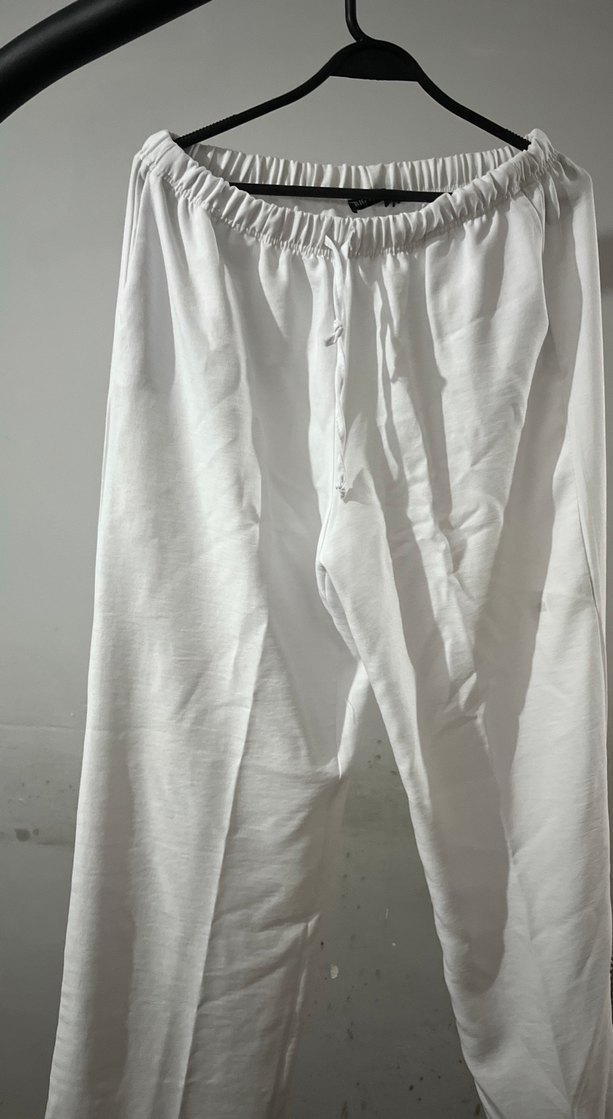 Beyaz keten kumaştan, rahat kesim ve midi boyda, lastikli beliyle kolay giyilen kadın pantolonu. Minimalist ve desensiz, günlük kullanım için uygun.