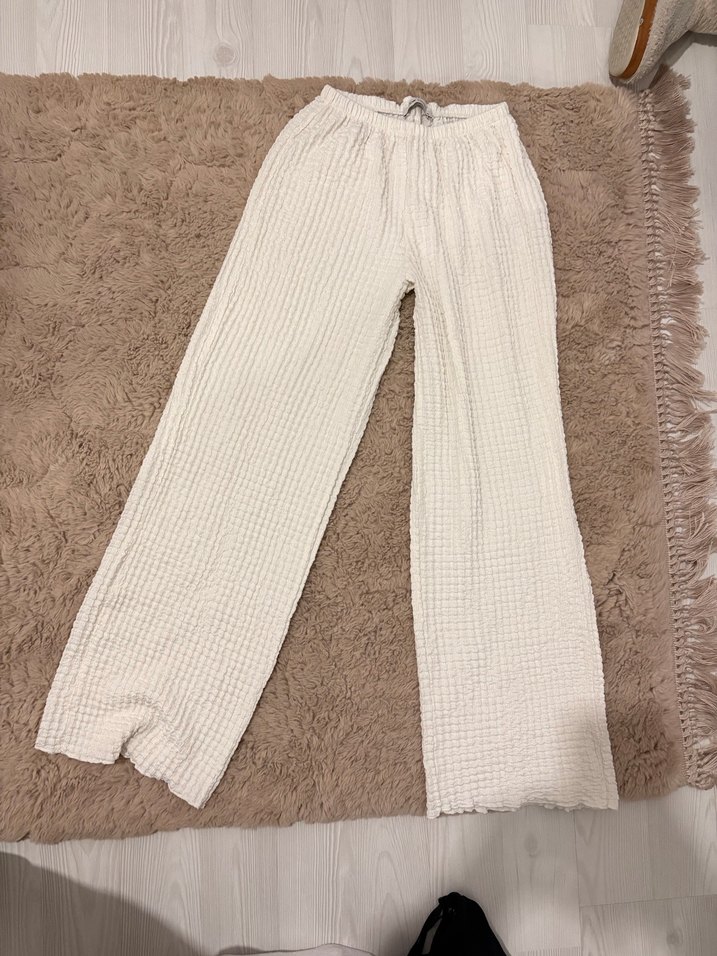 Beyaz keten kumaştan, midi boy ve rahat kesime sahip, yumuşak dokulu, günlük kullanıma uygun şık ve rahat kadın pantolonu.