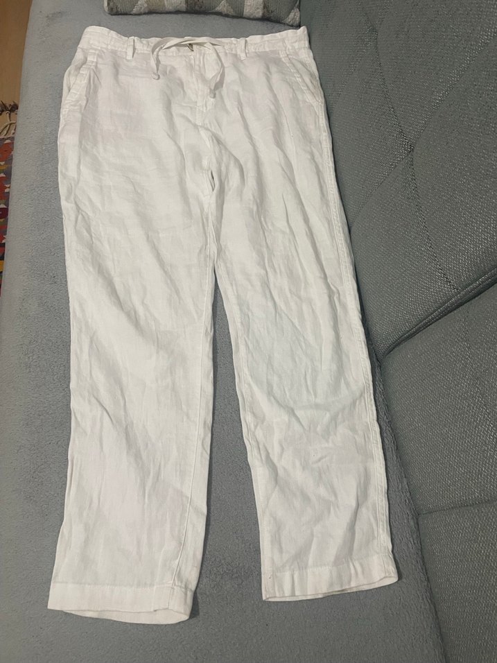 Beyaz keten kumaştan, rahat kesim ve midi boyda, gündelik kullanıma uygun rahat ve şık kadın pantolonu. 2-3 kez giyildi hiç bir sorunu yoktur