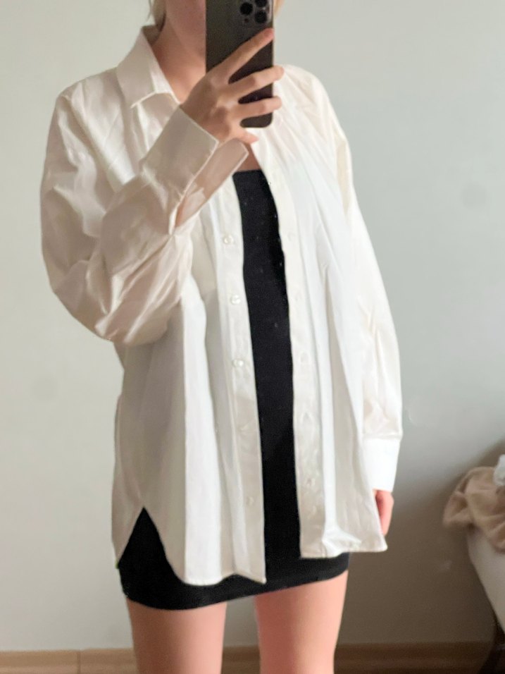 Beyaz keten kumaştan, salaş kesimli, uzun kollu ve yakalı bu gömlek günlük kullanım için sade ve şık bir görünüm sunar.