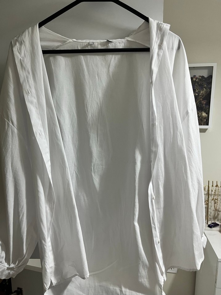 Beyaz keten, drapeli, yakalı ve uzun kollu kadın gömlek. Salaş kesim, midi boyda, minimal bohem tarzda, günlük kullanım için uygundur. ürünün arka kısmında küçük siyah leke vardır fotoğrafta görüldüğü gibi
