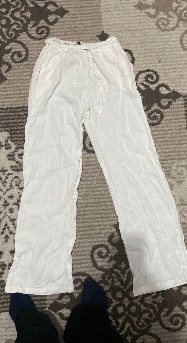 Beyaz keten, salaş kesim ve midi boy pantolon. Desensiz tasarımıyla rahat ve şık, günlük dış mekan kullanımı için uygundur.