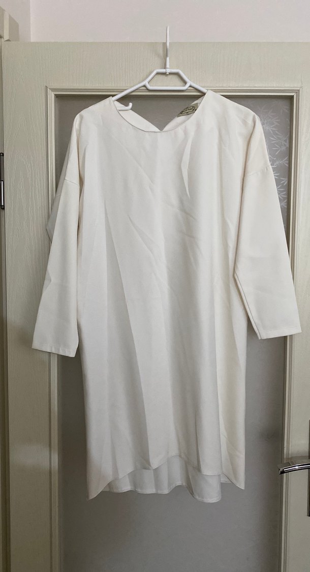 Beyaz keten kumaştan, salaş kesim ve drapeli detaylı, uzun kollu, yuvarlak yakalı midi tunik. Minimalist ve desensiz tasarım, günlük kullanım için uygundur.