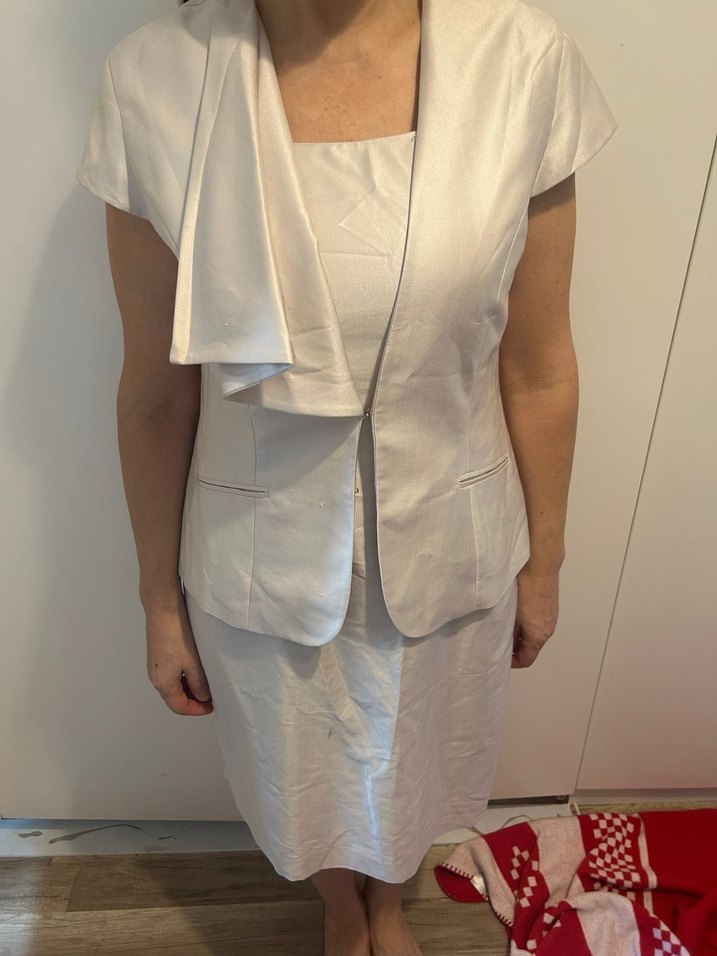 Beyaz keten saten kumaştan, kısa kollu, normal boy midi etekli, kesilmiş yaka ve drapeli detaylı kadın takımı. Davet ya da özel günler için uygun.