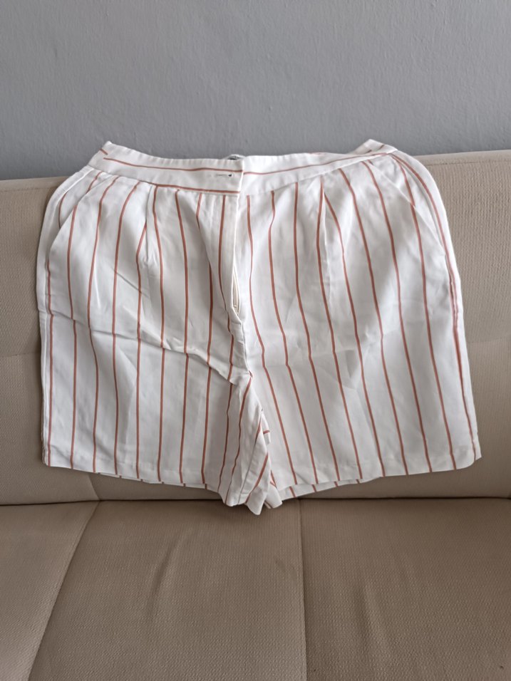 Beyaz keten mini şort, ince dikey çizgilerle rahat kesimde, günlük sokak stili için uygun.