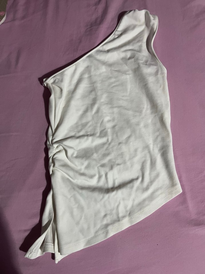 Beyaz keten kumaştan, drapeli ve straplez yakalı, kolsuz, normal uzunlukta ve midi kesim Minimalist sade tarzda, günlük kullanıma uygun.