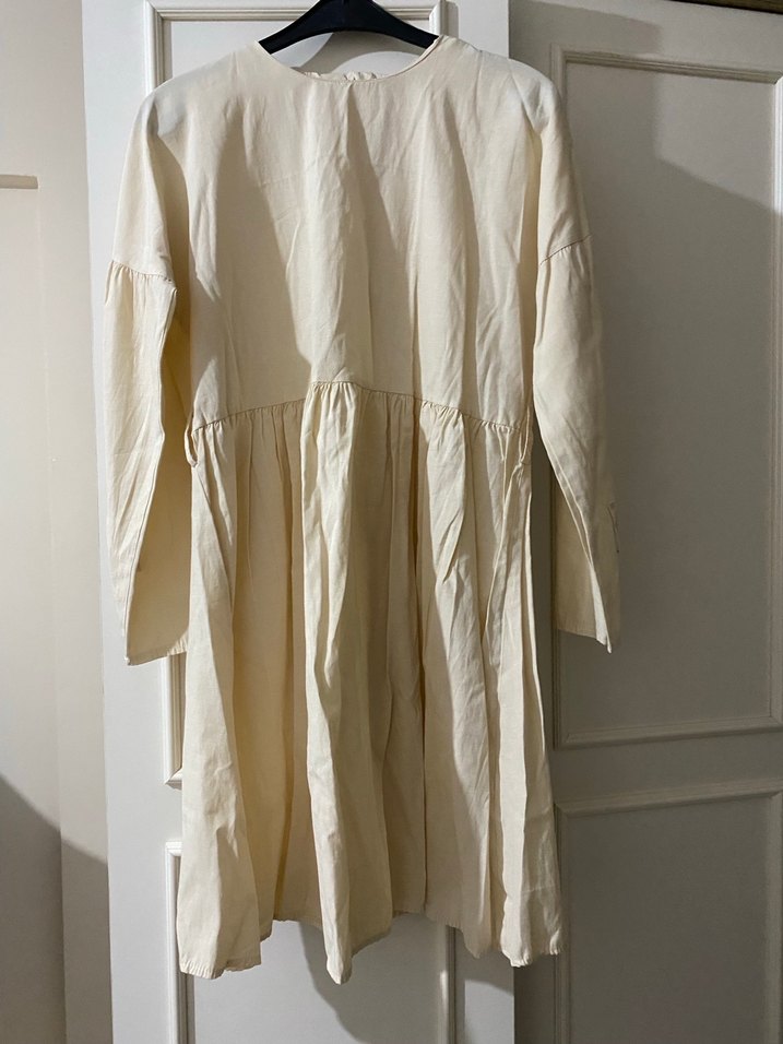 Beyaz keten hamile tunik, uzun kollu ve V yaka, bol ve drapeli kesime sahip. Minimalist, bohem tarzda günlük kullanım için uygundur. Kolu ve beli için kuşakları var
