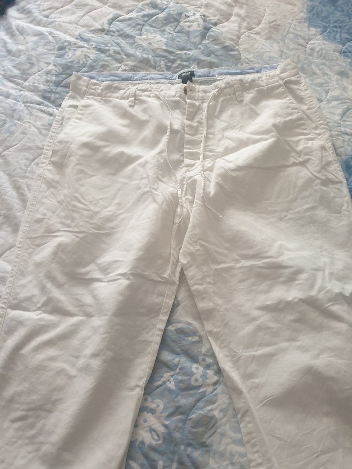 Beyaz keten kumaştan, midi boy ve normal kesim pantolon. Günlük kullanıma uygun sade ve rahat bir tasarım. en47 cm boy 96 cm