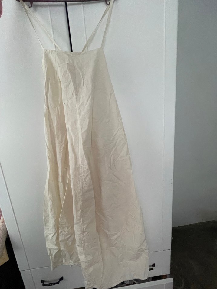 Beyaz keten kumaştan, askılı ve salaş kesimli, uzun ve drapeli elbise. Minimalist ve bohem tarzlar için uygun, günlük kullanıma hafif ve rahat.