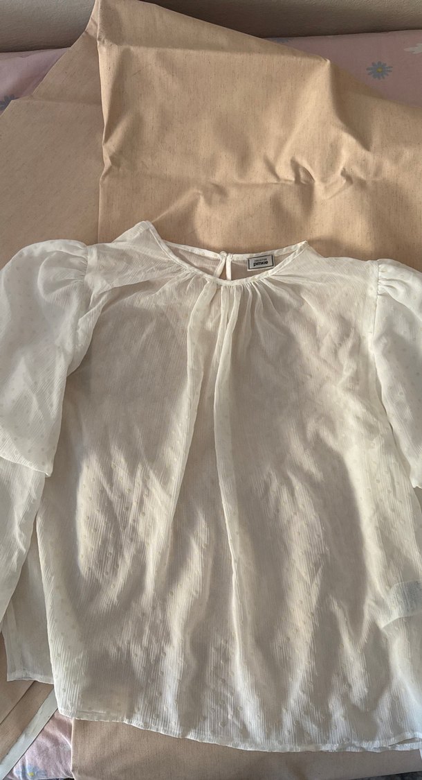 Beyaz keten kumaştan, uzun kollu, salaş kesim bohem stil bluz. Yakada ve kol uçlarında hafif fırfır detayları bulunur.