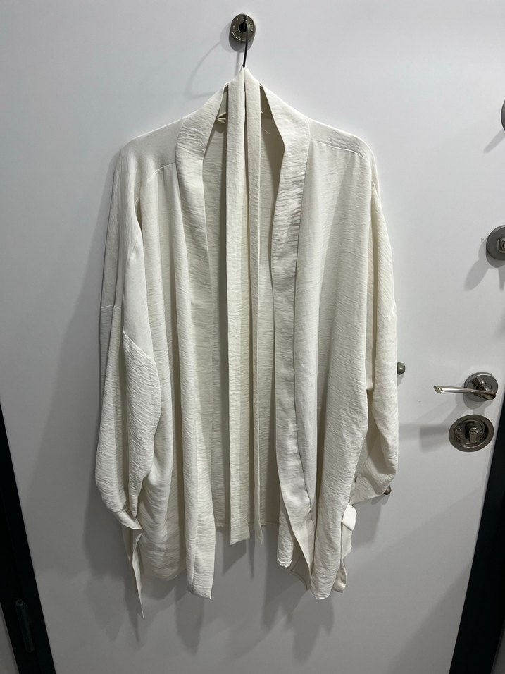 Beyaz keten kumaştan, uzun kollu ve drapeli, salaş kesim bohem kadın kimono. Minimalist ve desensiz tasarımıyla günlük kullanıma uygundur. 40/42 uyumlu