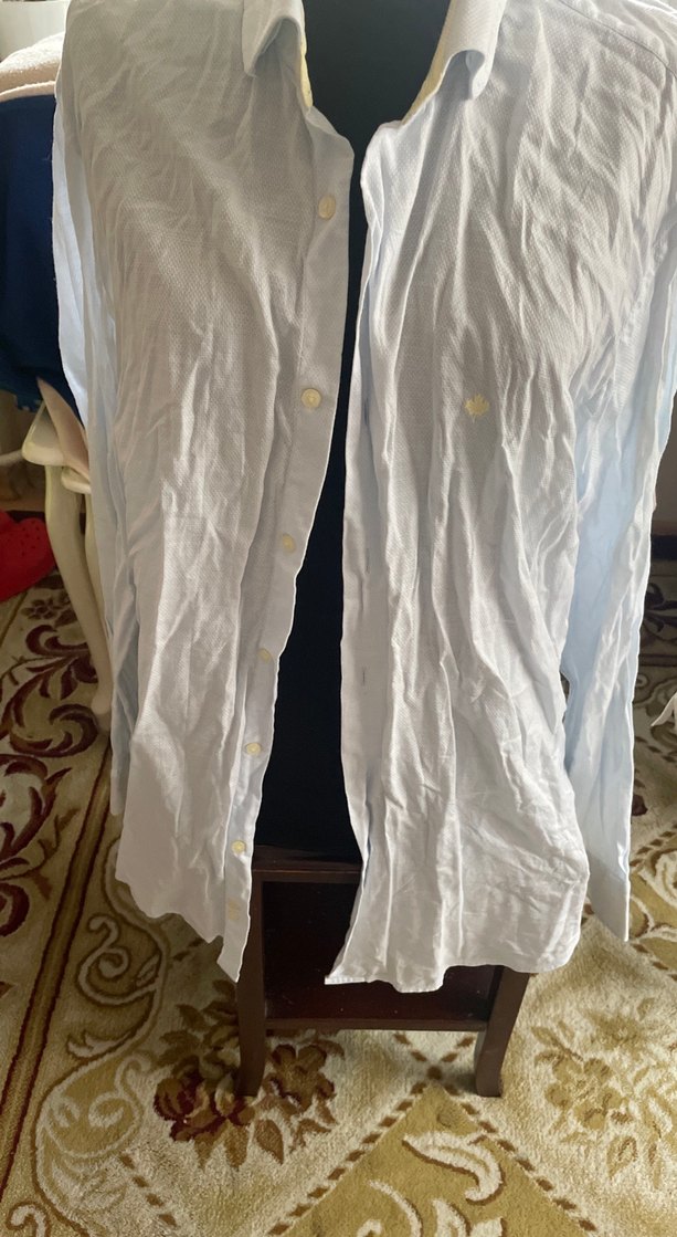 Beyaz keten kumaştan, düğmeli, yakalı ve uzun kollu, bol kesim midi uzunlukta kadın gömleği. Parlak ve desensiz, günlük kullanıma uygundur.