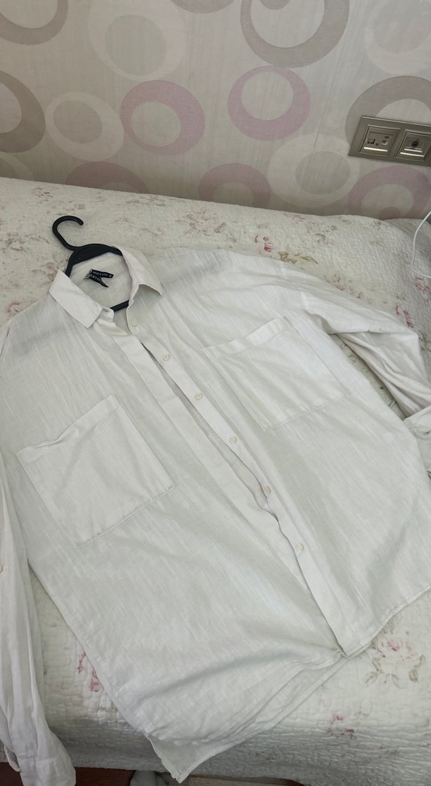 Beyaz keten kumaştan, düğmeli, uzun kollu ve yakalı gömlek. İki cep ve bol kesimiyle günlük kullanıma uygun sade bir tasarım.