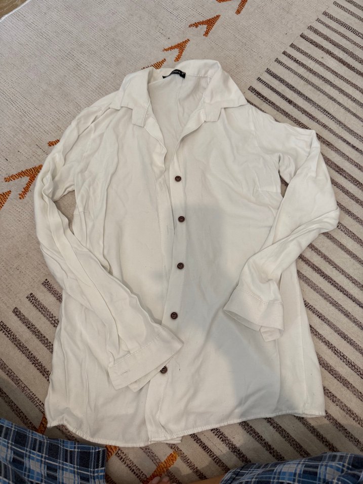 Beyaz keten, uzun kollu, düğmeli ve yakalı gömlek. Rahat kesimi ve normal boyu ile günlük sokak stiline uygundur.