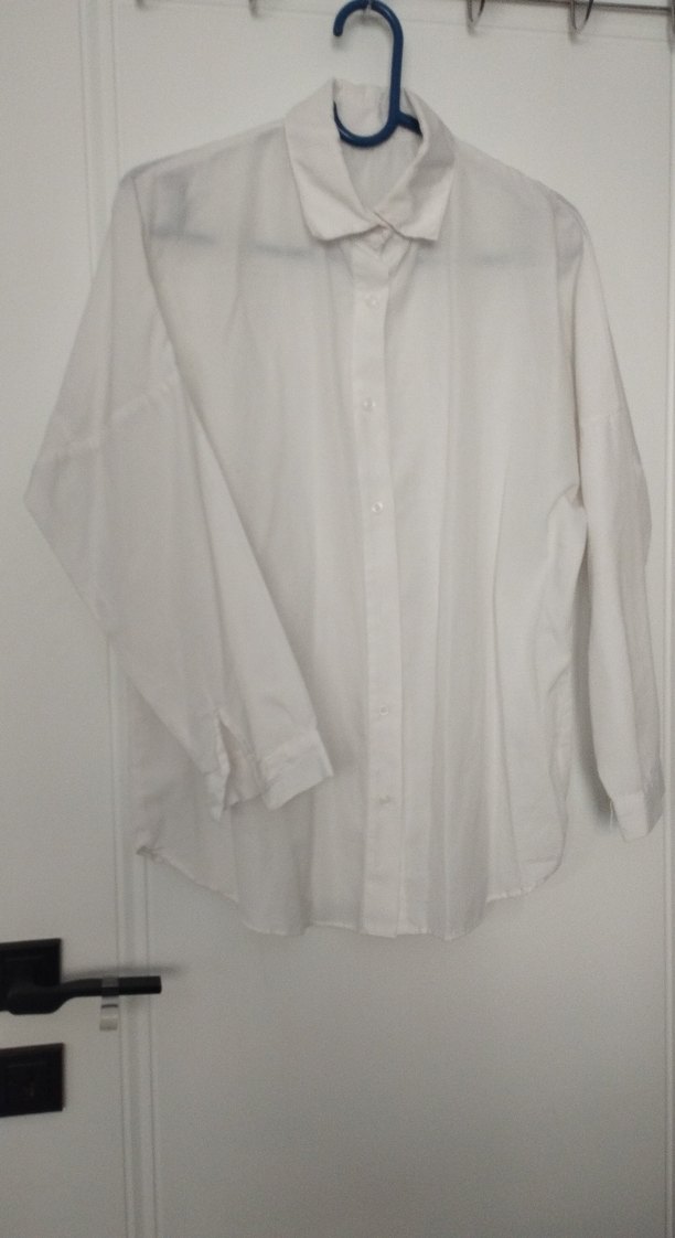 Beyaz keten gömlek, yakalı, uzun kollu ve düğmeli, rahat kesim ile minimalist ofis stiline uygundur.