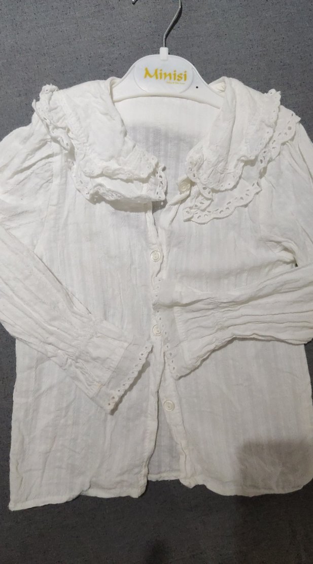 beyaz keten gömlek, uzun kollu ve düğmeli. Yakasında dantel detaylar bulunur, bol ve bohem tarzda vintage görünümlüdür. Japonyadan geldi sadece iki kez kullanıldı 3-4 yaş