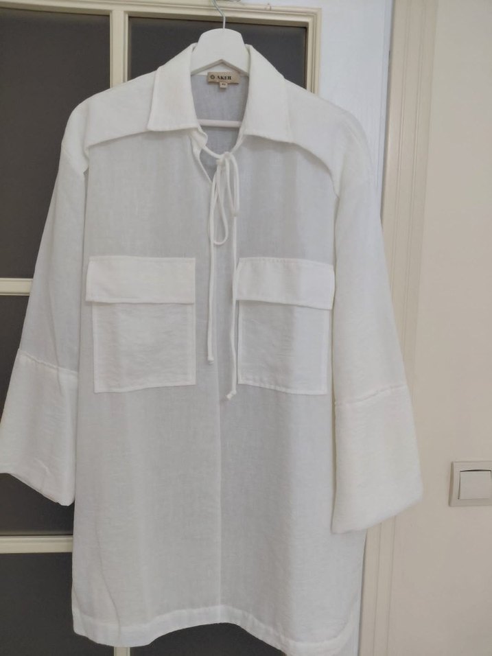 Bu beyaz keten gömlek, uzun kollu ve yakalıdır. Midi boyda, bol kesim ve önünde iki cep bulunur. Minimalist ve şık, günlük kullanım için uygundur.