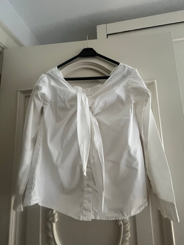 Düğmeli, keten kumaştan, uzun kollu, halter yaka ve normal midi boyda, bol kesim beyaz gömlek. Ofis için uygundur.