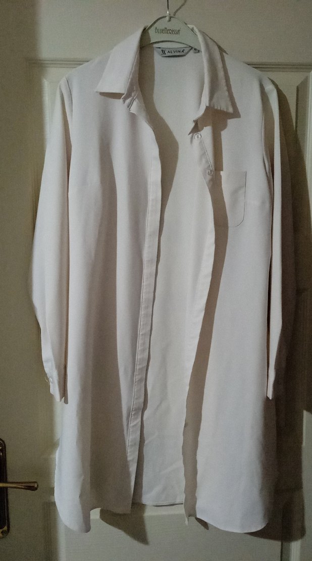 Beyaz keten kumaştan, notlu yaka ve uzun kollu, bol kesim midi uzunluğunda kadın gömlek. Ofis için uygun, sade ve drapeli tasarım. ☁️