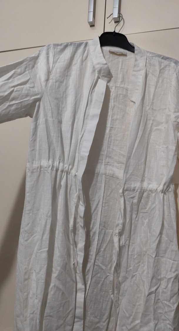 Beyaz keten kumaştan, yakalı ve kısa kollu, salaş kesim uzun gömlek. Minimalist bohem tarz için uygundur.