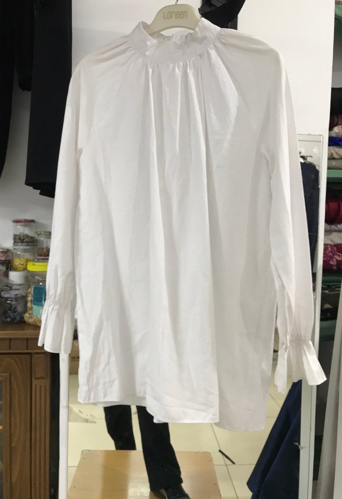 Beyaz keten kumaştan, uzun kollu ve yüksek yakalı bu gömlek, rahat kesimiyle günlük kullanıma uygun, şık ve rahat bir tercih sunar.