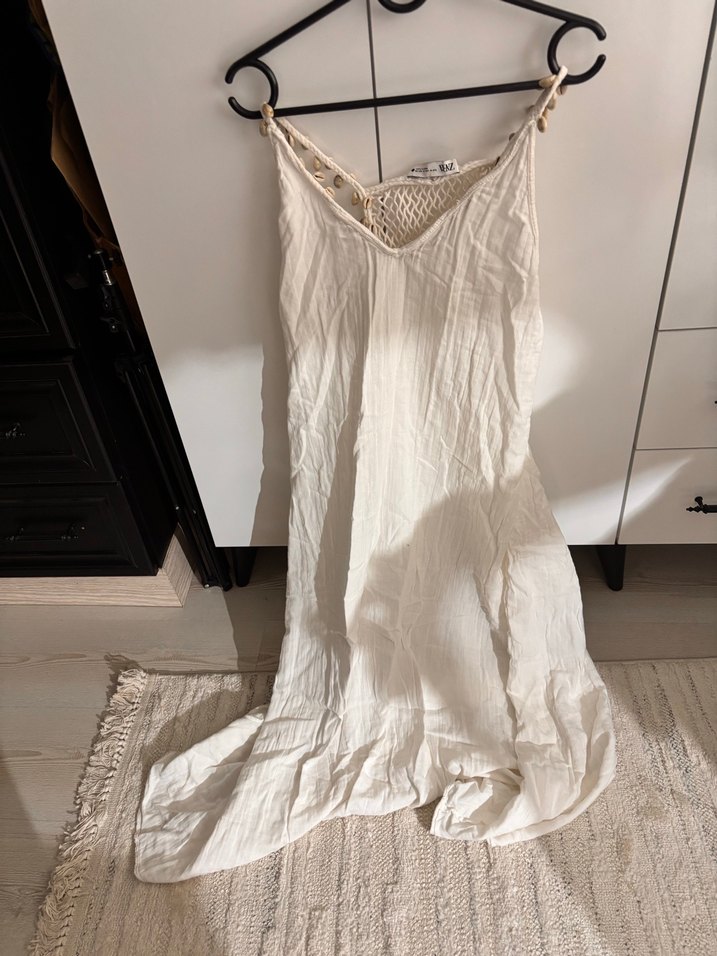 Beyaz keten uzun elbise, kolsuz ve V yakalıdır. Salaş kesimi ve drapeli bohem tarz sunar, günlük kullanıma uygundur.