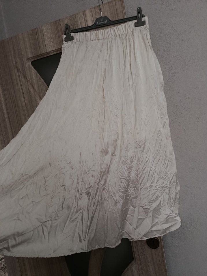Beyaz keten kumaştan uzun, salaş ve drapeli tasarıma sahip bohem tarzda etek, günlük kullanıma uygundur.