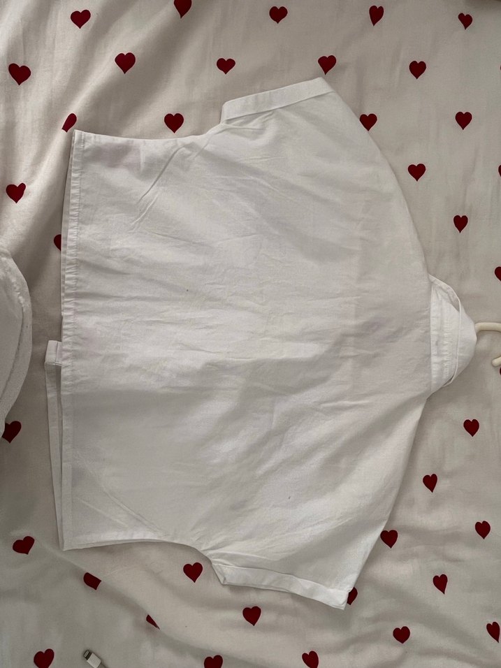 Beyaz keten kumaştan, V yakalı ve düğmeli ön kısmı olan bol kesim gömlek. Kısa kollu ve normal boyda, minimalist sokak stili için uygun.