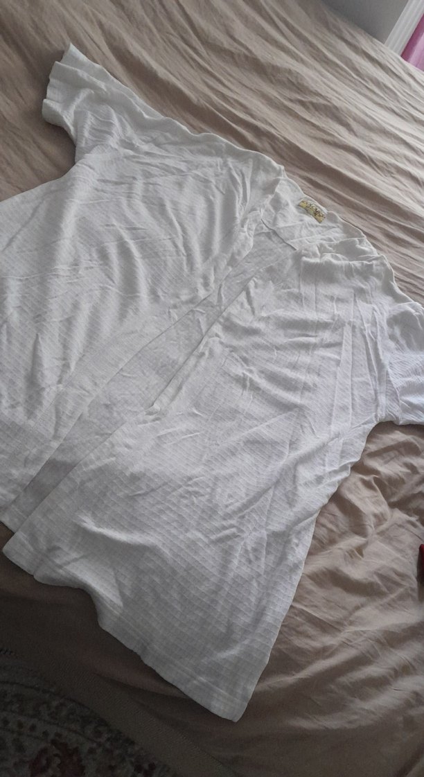 Beyaz keten kumaştan, kısa kollu, V yaka ve düğmeli hamile gömleği. Rahat kesim ve sade, minimalist tasarıma sahiptir.
