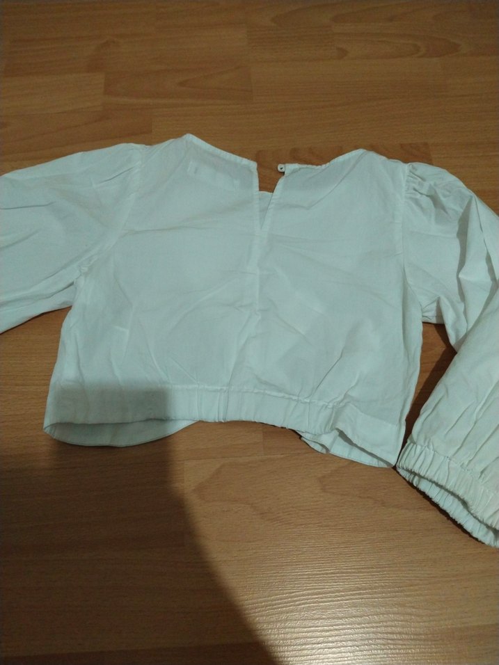 Beyaz keten kumaştan, uzun kollu, V yaka ve düğmeli, bol kesim kısa kadın bluz. Minimalist tarzda, günlük kullanıma uygun.