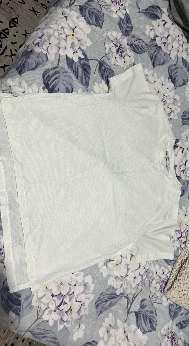 Beyaz keten kumaştan yapılmış, V yaka ve kısa kollu kadın gömleği. Salaş kesim ve fırfır detaylarıyla minimal ve günlük kullanıma uygun midi boyda.