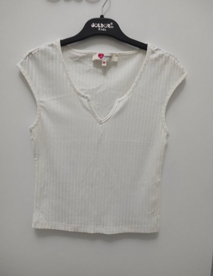 Beyaz, kolsuz, V-yaka ve mini uzunlukta, vücuda oturan kadın büstiyeri. Günlük ve sokak stiline uygun, sade ve desensiz tasarım. Sadece 1 defa kullanıldı.
