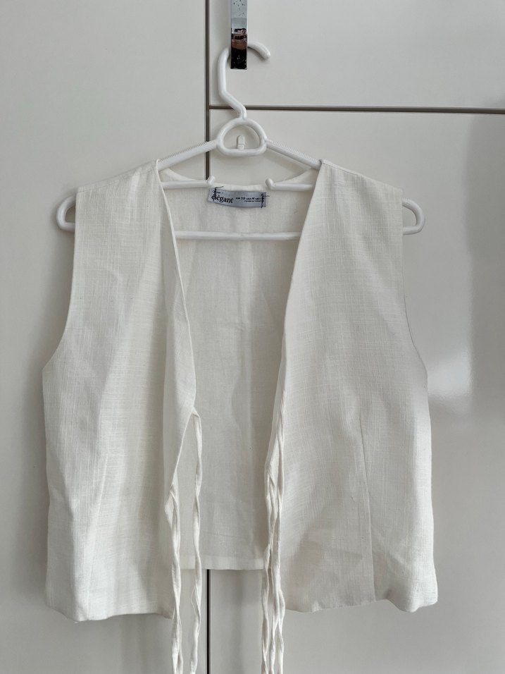 Beyaz keten kumaştan, V yaka ve kolsuz tasarıma sahip, midi boyda ve regular fit yelek. Minimalist ve bohem tarzı yansıtır. Herhangi bir deformesi yoktur.