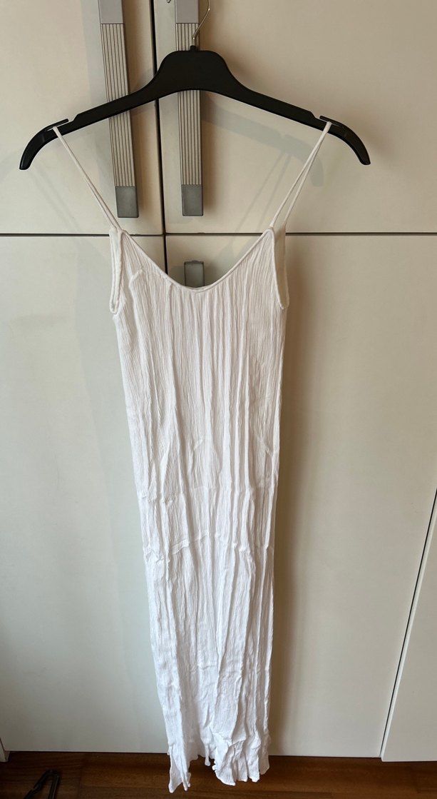 Beyaz keten uzun elbise, drapeli detaylı, v yaka ve kolsuz yapısıyla minimal ve bohem tarzı yansıtır.