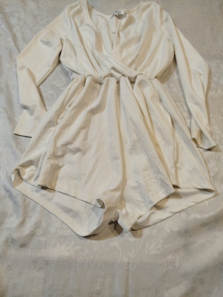 Beyaz keten kumaştan, uzun kollu, V yaka ve drapeli tasarıma sahip kısa tulum. Bol kesimi ve bohem stili ile düğün için uygun.