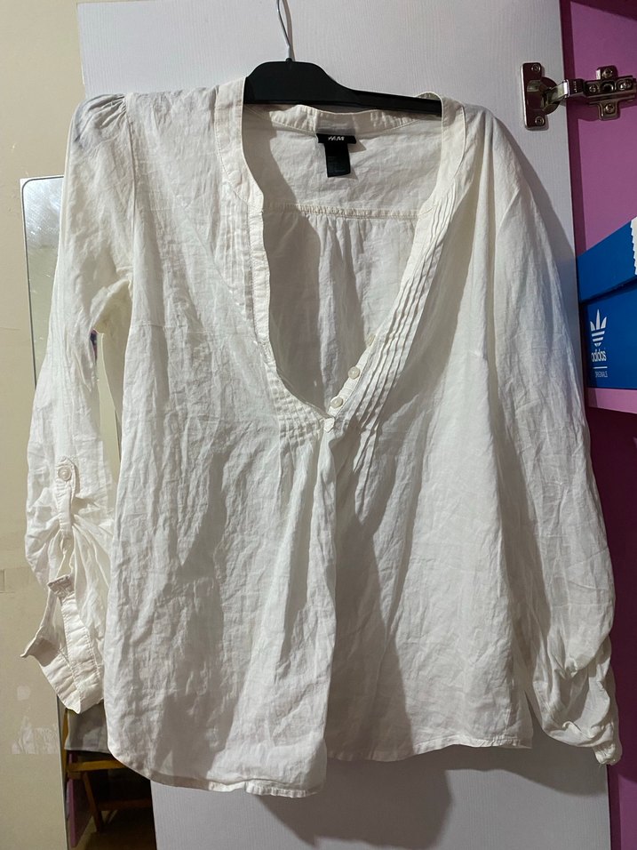 Beyaz keten kumaştan, V yakalı, uzun kollu, düğmeli ve bol kesim bohem gömlek.
